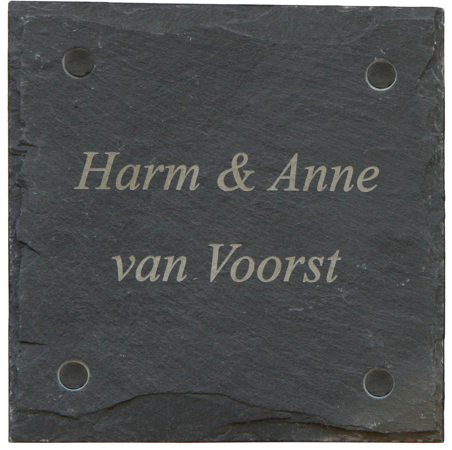 Leisteen is een zeer exclusieve natuursteen welke uitstekend geschikt is voor gebruik in en rondom uw woning. Leisteen wordt gewonnen in open groeven en mijnen. Het ontstaat uit klei die onder druk in de loop van vele jaren omgevormd wordt tot leisteen. De steen is sterk gelaagd en grijs/zwart van kleur. In de groeve worden schollen steen van de rots gespleten. Hierdoor ontstaat een natuurlijk splijtoppervlak en ruwe afgebrokkelde randen. Onze leisteen naamborden hebben door dit ontstaansproces een onregelmatig uiterlijk. Elk leisteen naambord is gelaagd en heeft een afgebrokkelde rand. Elk leisteen naambord is daardoor, hoewel dezelfde afmeting, toch steeds weer anders, uniek! Leisteen is slijtvast, maar kan aan de randen afschilferen. Door het robuuste uiterlijk wordt dit in de praktijk niet als storend ervaren. De tekst wordt in alle leisteen naamborden door middel van lasertechniek gegraveerd, waardoor uw naam niet weg kan slijten of vervagen. De gravure in leisteen wordt creme-grijs van kleur (met uitzondering van de 2511 t/m 2514). Alle leisteen naamborden zijn voorzien van schroefgaten en worden compleet met bevestigingsmateriaal geleverd. De schroefkoppen kunt u afdekken met de bijgeleverde zwarte afdekviltjes.