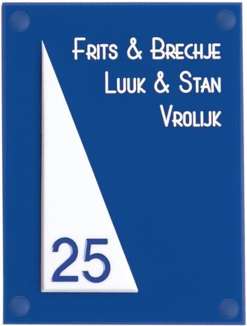 Perspex is een stevige kunststofsoort (3 mm dikte), welke uitstekend geschikt is voor gebruik in en rondom uw woning. De tekst wordt in alle perspex-naamborden gegraveerd, waardoor uw naam niet weg kan slijten of vervagen. De transparante perspex naamborden worden aan de achterzijde ingegraveerd (waardoor de voorkant glad blijft) en de gekleurde perspex naamborden worden aan de voorzijde ingegraveerd. Tot slot: de perspex-naamborden zijn standaard voorzien van schroefgaten (tenzij anders vermeld) en worden geleverd met afstandbusjes en afdekdopjes waardoor u het naambord eenvoudig op een korte afstand van de muur kunt monteren. Perspex een luxe kunststofsoort dat tegen een stootje kan!