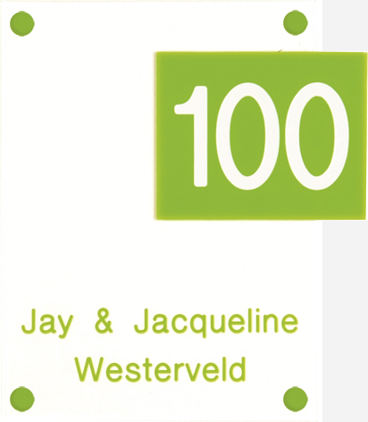 Perspex is een stevige kunststofsoort (3 mm dikte), welke uitstekend geschikt is voor gebruik in en rondom uw woning. De tekst wordt in alle perspex-naamborden gegraveerd, waardoor uw naam niet weg kan slijten of vervagen. De transparante perspex naamborden worden aan de achterzijde ingegraveerd (waardoor de voorkant glad blijft) en de gekleurde perspex naamborden worden aan de voorzijde ingegraveerd. Tot slot: de perspex-naamborden zijn standaard voorzien van schroefgaten (tenzij anders vermeld) en worden geleverd met afstandbusjes en afdekdopjes waardoor u het naambord eenvoudig op een korte afstand van de muur kunt monteren.