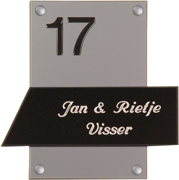 Perspex is een stevige kunststofsoort (3 mm dikte), welke uitstekend geschikt is voor gebruik in en rondom uw woning. De tekst wordt in alle perspex-naamborden gegraveerd, waardoor uw naam niet weg kan slijten of vervagen. De transparante perspex naamborden worden aan de achterzijde ingegraveerd (waardoor de voorkant glad blijft) en de gekleurde perspex naamborden worden aan de voorzijde ingegraveerd. Tot slot: de perspex-naamborden zijn standaard voorzien van schroefgaten (tenzij anders vermeld) en worden geleverd met afstandbusjes en afdekdopjes waardoor u het naambord eenvoudig op een korte afstand van de muur kunt monteren. Perspex een luxe kunststofsoort dat tegen een stootje kan!