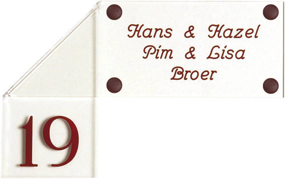 Perspex is een stevige kunststofsoort (3 mm dikte), welke uitstekend geschikt is voor gebruik in en rondom uw woning. De tekst wordt in alle perspex-naamborden gegraveerd, waardoor uw naam niet weg kan slijten of vervagen. De transparante perspex naamborden worden aan de achterzijde ingegraveerd (waardoor de voorkant glad blijft) en de gekleurde perspex naamborden worden aan de voorzijde ingegraveerd. Tot slot: de perspex-naamborden zijn standaard voorzien van schroefgaten (tenzij anders vermeld) en worden geleverd met afstandbusjes en afdekdopjes waardoor u het naambord eenvoudig op een korte afstand van de muur kunt monteren. Perspex een luxe kunststofsoort dat tegen een stootje kan!